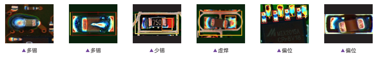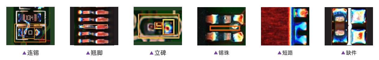 錯件,缺件,極性,偏位,翻件,破損,IC彎腳,異物,立碑等